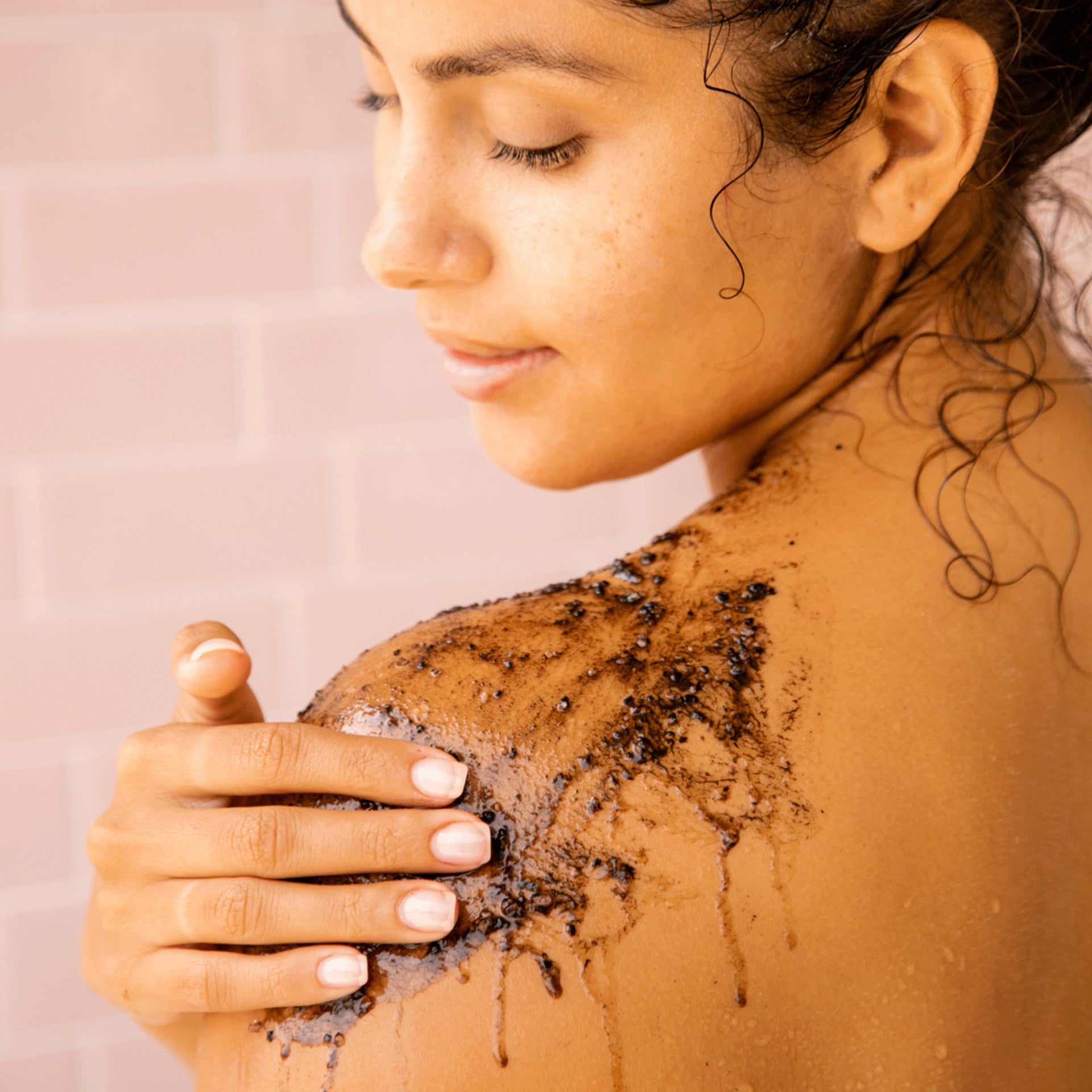 Invigorating cacao and coffee body scrub buffs away bumps and flakes to leave skin soft, smooth, and glowing.